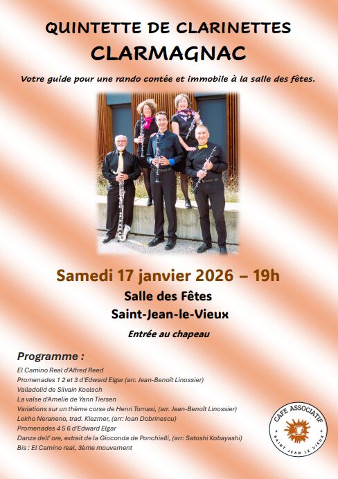 Nous accueillerons le quintette Clarmagnac qui nous emmènera en randonnée au son des clarinettes.